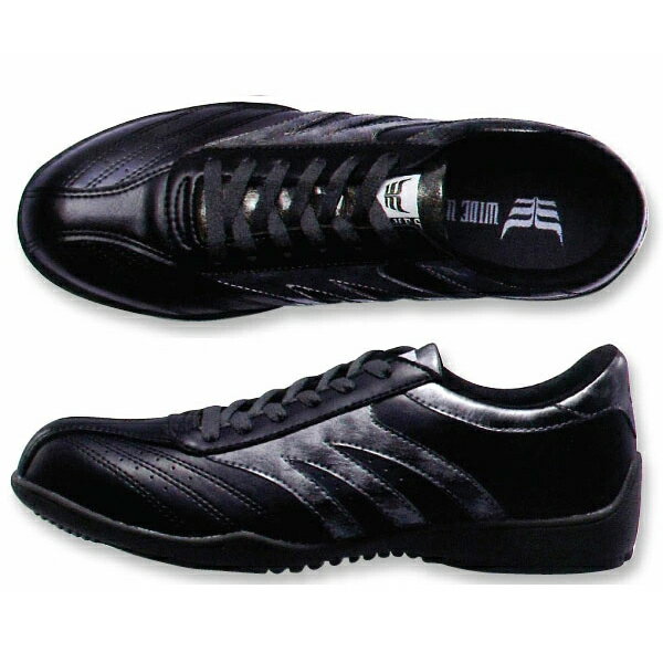 WIDE WOLVES(ワイドウルブス) WW-502 スニーカー安全靴 サイズ:24.5〜28.0mm カジュアル感覚のスリムスニーカー「ひときわ異彩を放つオールブラックスタイル。 アクセントの効いたエナメルラインが高級感を演出。」